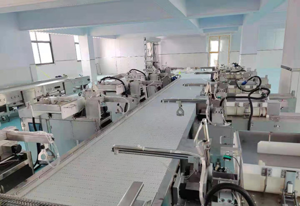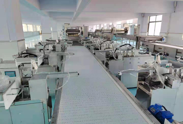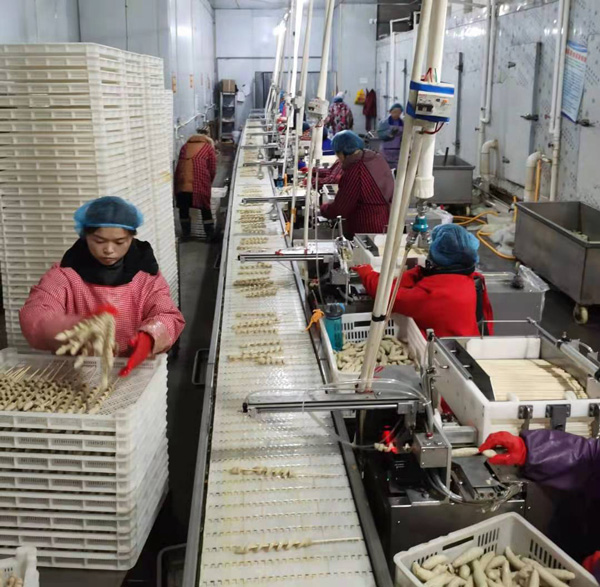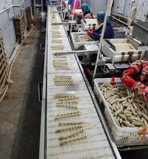 该设备自动完成面筋的穿串,旋切,拉串、输送等程序,实现了从进料到产品真正意义上的全自动化生产过程。大幅度减少操作工人,提高生产效率和降低人工成本。且面筋卷生产为仿手工缠绕制作,全过程无挤压、不使用磨具,产品完全保留了手工面筋卷的外形和口感。设备管理简单、运行稳定、无故障,可24小时连续生产。